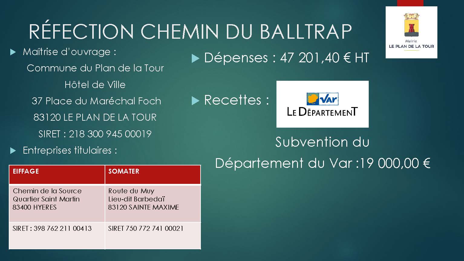 -Travaux réalisés : Le chemin du Ball-Trap est désormais entièrement goudronné, offrant un confort de circulation amélioré et une meilleure résistance aux intempéries.